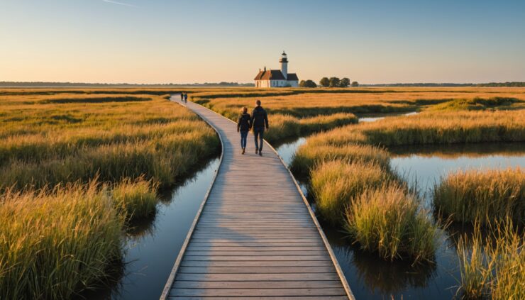 Second marais de France après la Camargue, Brière vous transporte dans un univers aquatique fascinant ! Ce labyrinthe de canaux, d’îles et de roselières abrite une faune exceptionnelle : hérons cendrés, cistudes d’Europe, libellules multicolores. Les balades en chaland traditionnel révèlent des panoramas uniques, impossible à découvrir autrement. Depuis Mesquer, comptez 30 minutes pour atteindre Saint-Joachim ou La Chapelle-des-Marais, portes d’entrée privilégiées du parc. Les observatoires ornithologiques gratuits ponctuent les sentiers pédestres, parfaits pour un séjour familial bord de mer enrichi d’aventures nature. L’été, les nénuphars transforment les étendues d’eau en jardins flottants spectaculaires. Votre hébergement nature Parc Brière peut même proposer des sorties nocturnes pour écouter le concert des batraciens sous les étoiles.
